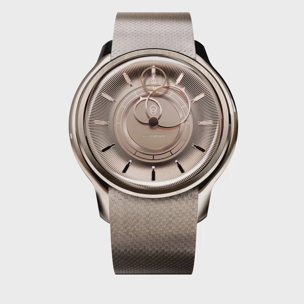 The one-piece dial of La Pièce No. 2 Rose Gold comes to life with a sculptural radial pattern, highlighted by indexes with warm reflections. Its rose-gold tone makes a bold, sophisticated statement, while the floating second hand lightly skims the dial, adding a touch of airy movement.